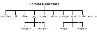 The namespace provided by the camera service allows the user to control a remote digital camera and download the images currently stored on it. These images are found in the jpg directory and thumbnails of each image in the Inferno image format are found in the thumb directory. From an Inferno shell, any of these images may be viewed using The camera is controlled by writing commands to the ctl file using the echo command e.g. will set the zoom on the camera to maximum. Each of the control commands is a four letter string and with the exception of 'snap' (used to take a photo) take a single integer argument. These four letter commands, along with a description and valid parameter values can be found by reading the abilities file using The tkinterface.dis file is an executable and provides a GUI to the camera using the same mechanism of writing to the ctlfile. All the remaining files may be read using cat to find out some information about the camera's current state. Power and storage contain the camera's power setting (5 = connected to mains supply) and memory usage respectively. Date and state may be written to as well as read from, for example will return the current ' zpos' (zoom position) value.