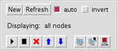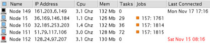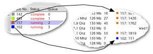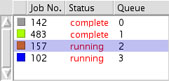 Each job is assigned a colour which is then used in the client list to show which clients are running the job. The screen colour of the computer icon for each client indicates its connected status as shown above. The interface itself is made up of four main parts: