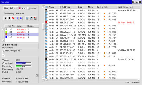 The Inferno Grid System can be controlled remotely and securely from any machine on the network, giving complete freedom to grid administrators. A graphical interface is provided to allow users to control and monitor the status of jobs and clients within the grid. Being able to see the grid at a glance and sort on any client attribute enables users to quickly find non-working or under performing clients.